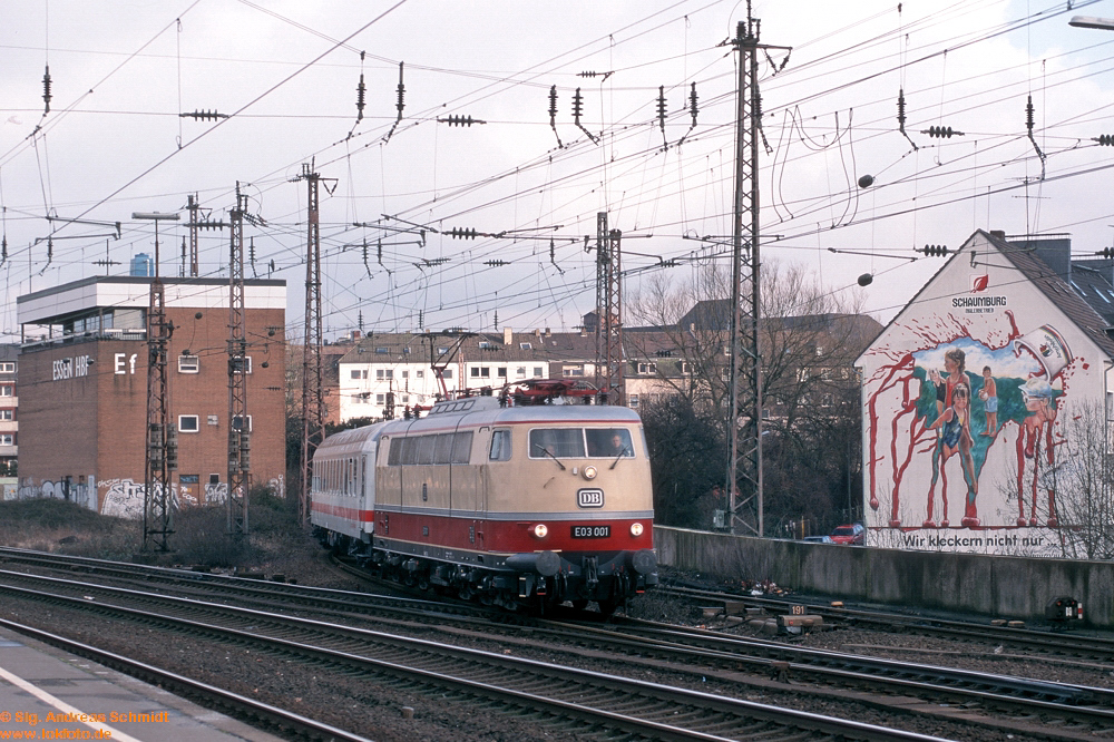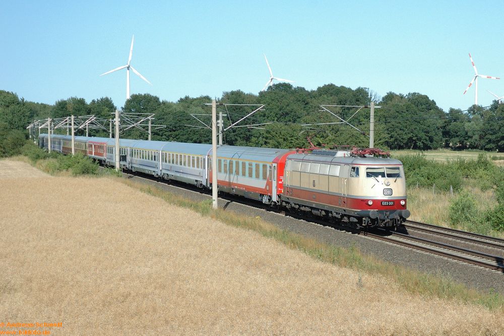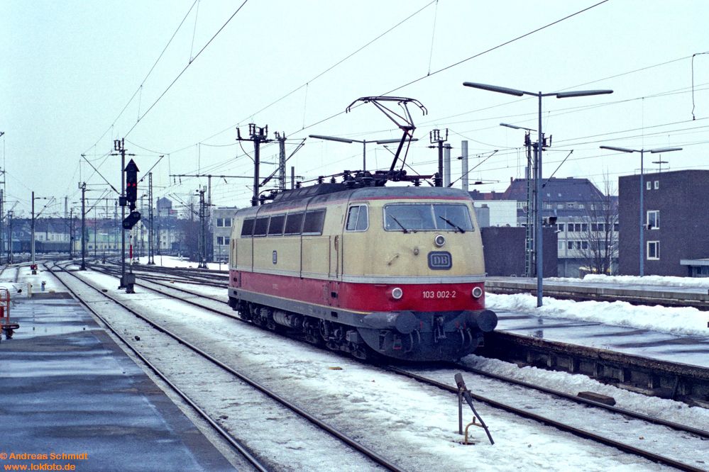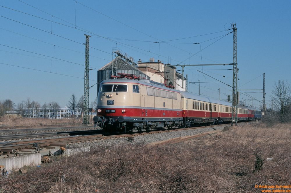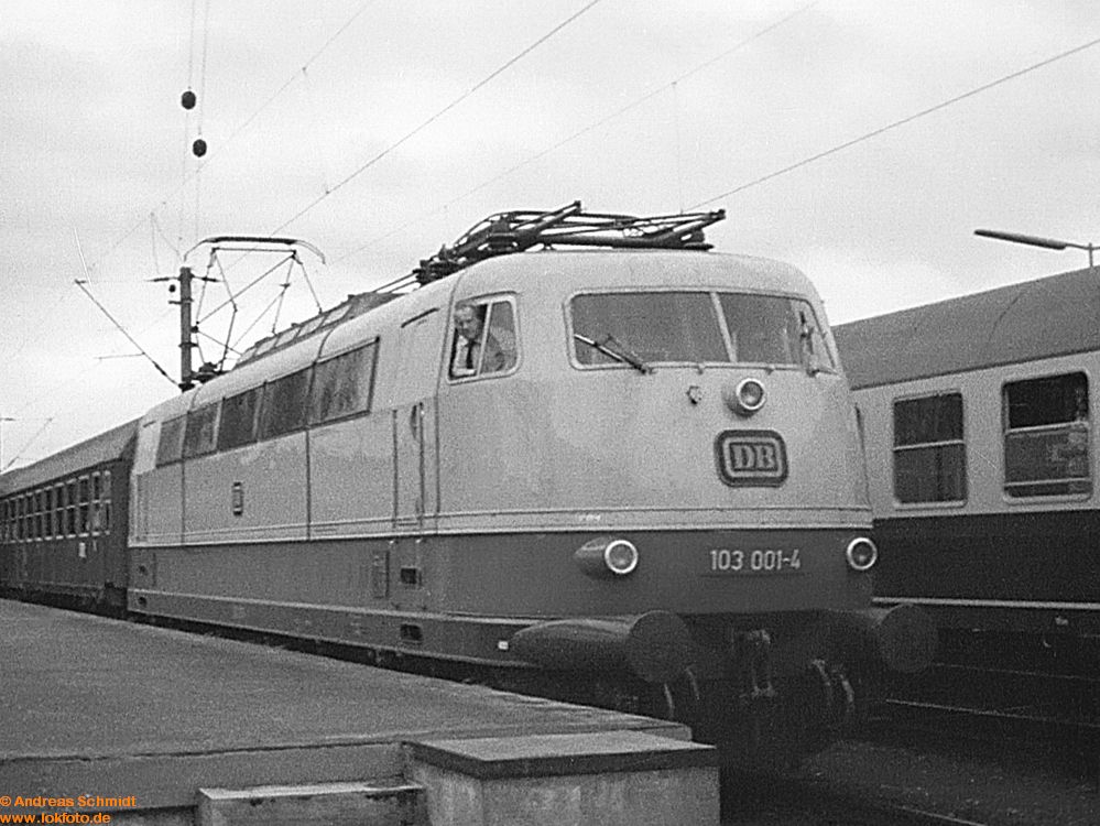 Als 1970 die Serienlieferung der BR 103 begann, lebte ich im Süden von Hannover in ziemlicher Nähe der Nord-Süd-Strecke. Die Hauptstraße - und damit auch mein Schulweg - führte ‘dummerweise’ über einen Bahnübergang, und da dort auch noch die Gleise zur Güterumgehungsbahn lagen, bedeutete das auf meinem Schulweg manchmal einige Wartezeit. Zwei Jahre später - die Serienmaschinen 103 101 bis 103 215 waren ausgeliefert - machte ich meine ersten Fotos mit der alten Agfa meines Vaters. Zwangsläufig kam mir natürlich die BR 103 vor die Linse, auch wenn meine Fototechnik noch nicht beim Thema ‘Geschwindigkeit von Objekten und angepasste Belichtungszeit/Blende‘ angekommen war. Besonders begeistert war ich allerdings immer dann, wenn eine Vorserienlok unterwegs war - die hatte ich in meinen “Vor-Foto-Jahren” meist vor dem TEE “Blauer Enzian” zu Gesicht bekommen.